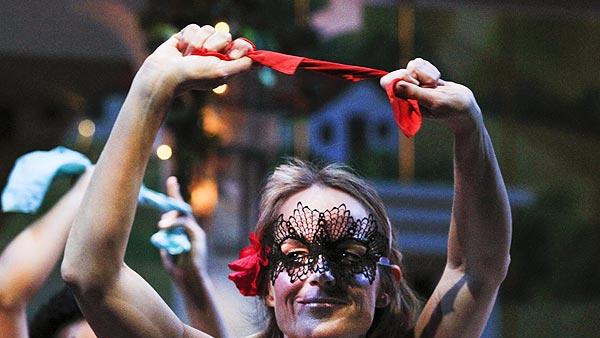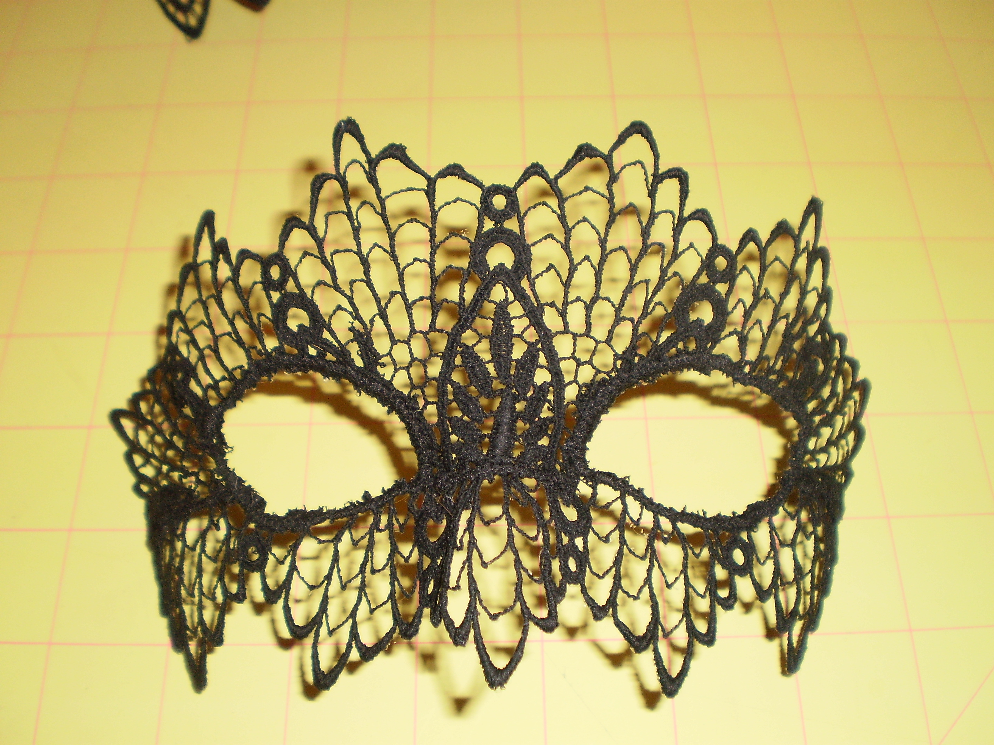 Notes: The masks for the ladies were created from lace: cut up, pieced into the desired form, stiffened and mounted on bands. The men’s Zorro style masks had an internal structure to create the shape, constructed to look as if it were a simple scarf. Costume Designer: Holly Poe Durbin.