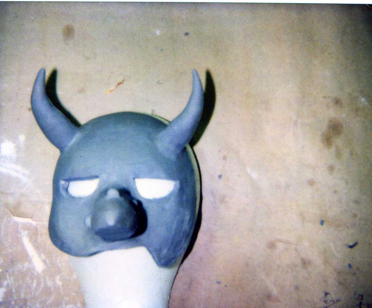 Notes: These sculpts were for the Montague masks for Sir Peter Hall’s Romeo and Juliet. The designer, John Gunter, chose these “rude” masks for Romeo’s boys, while Romeo himself wore the Devil mask, in bright, acid colors. The Capulets, in contrast, wore more classic forms in gold and silver. Finished masks were made from thermoplastic.