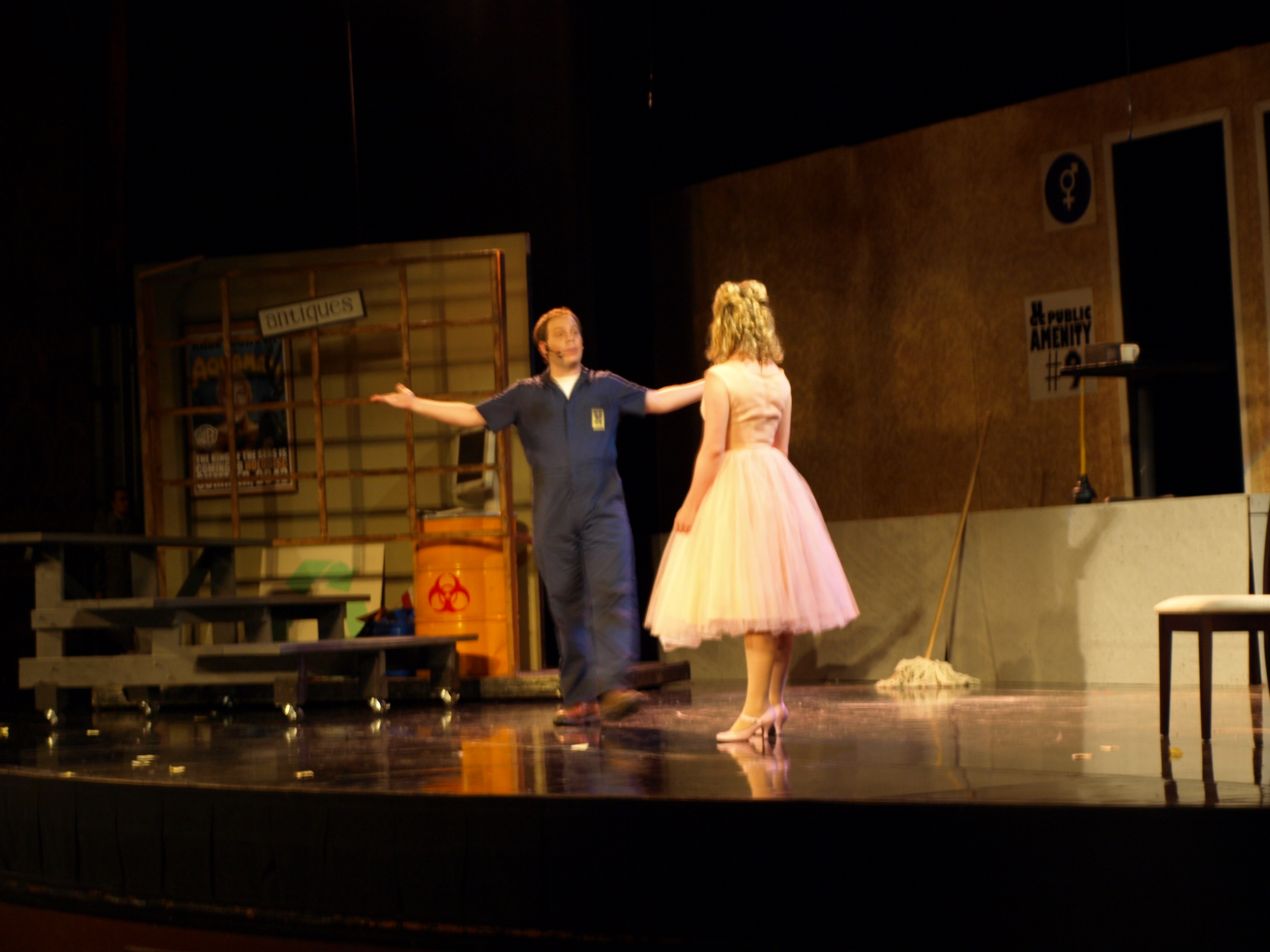 Design Brief: The theme of the Relevant Stage’s production of Urinetown was re-purposed and re-used materials. The people of Urinetown’s clothes are ragged, dirty and recycled; even the leather coats of Lockstock and Barrel are patchwork. The exceptions are Cladwell’s ice cream suit and Hope, clean and pretty in a vintage 50’s inspired pink frock. ~KM